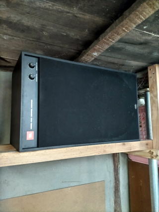 しまいこんでいた山水907とJBL4312を復活させようと置場を作ってみた。工房内は狭いので4312は物置の上に置いてみた。
